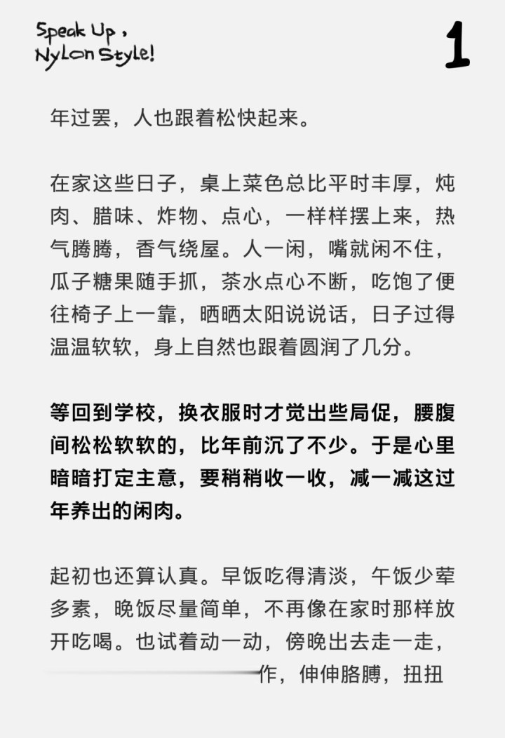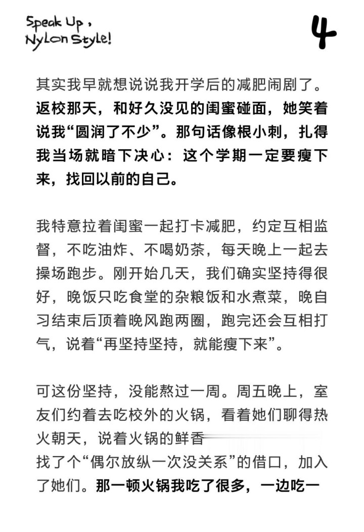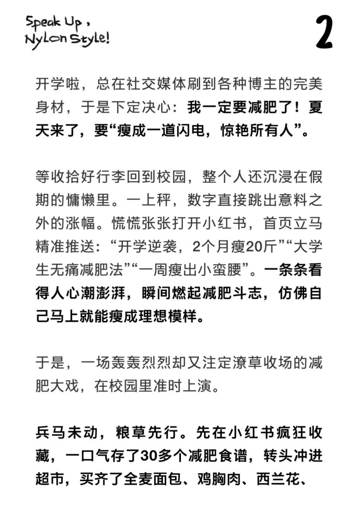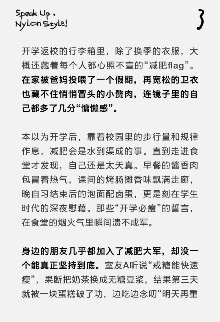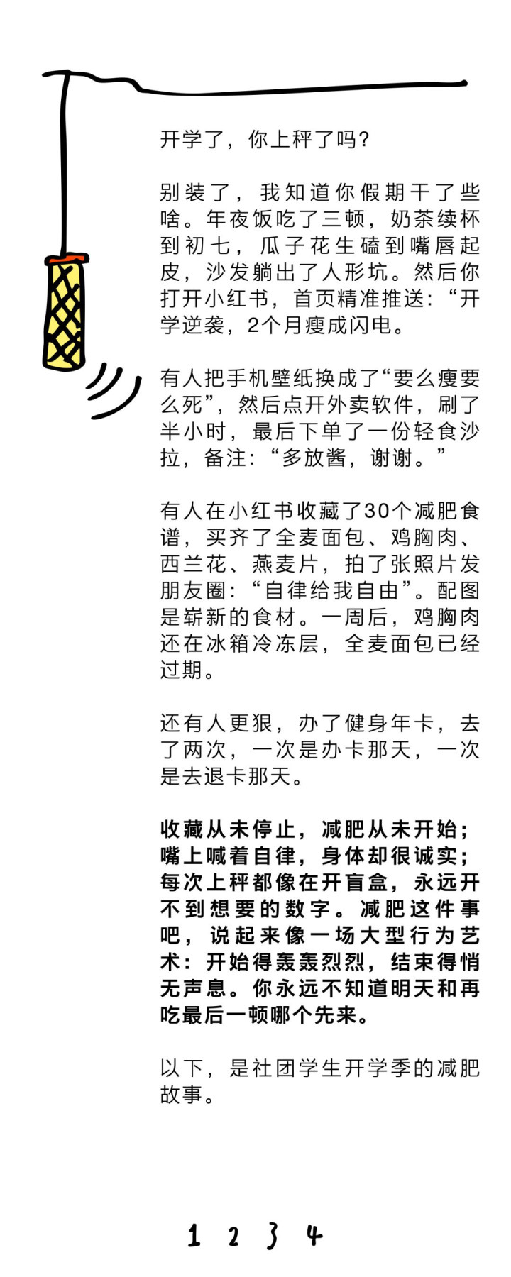 开学了,你上称了吗? 别装了,我知道你假期干了些啥。年夜饭吃了三顿,奶茶续杯到初七,瓜子花生磕到嘴唇起皮,沙发躺出了人形坑。然后你打开小红书,首页精准推送:“开学逆袭,2个月瘦成闪电。 有人把手机壁纸换成了“要么瘦要么死”,然后点开外卖软件,刷了半小时,最后下单了一份轻食沙拉,备注:“多放酱,谢谢。” 有人在小红书收藏了30个减肥食谱,买齐了全麦面包、鸡胸肉、西兰花、燕麦片,拍了张照片发朋友圈:“自律给我自由”。配图是崭新的食材。一周后,鸡胸肉还在冰箱冷冻层,全麦面包已经过期。 还有人更狠,办了健身年卡,去了两次,一次是办卡那天,一次是去退卡那天。 收藏从未停止,减肥从未开始;嘴上喊着自律,身体却很诚实;每次上称都像在开盲盒,永远开不到想要的数字。减肥这件事吧,说起来像一场大型行为艺术:开始得轰轰烈烈,结束得悄无声息。你永远不知道明天和再吃最后一顿哪个先来。 以下,是社团学生开学季的减肥故事。 “我的意志比薄饼还脆” 姓名:紫菜蛋卷汤 学校:中央美术学院 年过罢,人也跟着松快起来。 在家这些日子,桌上菜色总比平时丰厚,炖肉、腊味、炸物、点心,一样样摆上来,热气腾腾,香气绕屋。人一闲,嘴就闲不住,瓜子糖果随手抓,茶水点心不断,吃饱了便往椅子上一靠,晒晒太阳说说话,日子过得温温软软,身上自然也跟着圆润了几分。 等回到学校,换衣服时才觉出些局促,腰腹间松松软软的,比年前沉了不少。于是心里暗暗打定主意,要稍稍收一收,减一减这过年养出的闲肉。 起初也还算认真。早饭吃得清淡,午饭少荤多素,晚饭尽量简单,不再像在家时那样放开吃喝。也试着动一动,傍晚出去走一走,或跟着视频做些简单动作,伸伸胳膊,扭扭腰,不求大汗淋漓,只当活动筋骨。 只是坚持起来,实在不易。半夜追剧时格外容易饿,闻到一点室友夜宵的香味就心神不定。那些减脂的法子看着简单,真落到自己身上,才知道有多磨人。动作做不了几下便累,清淡饭菜吃久了也寡淡,心里总惦记着点有味儿的东西。 本来决心就不算坚固,稍微一松,便全线溃败。路过小吃店忍不住买一点,晚上饿了随手吃点零食,安慰自己只此一次,下不为例。可开了头,就收不住,先前的克制一点点散掉,减肥这件事,也就名存实亡。折腾到现在,体重没下去多少,人倒是依旧软软糯糯,一身闲肉安安稳稳。 说起来好笑,明明想瘦一点,结果决心像年糕一样粘不住,意志比春冰还薄,稍微一碰就破。 其实静下心想想,也不必太较真。年后这点赘肉,原是安稳日子养出来的,是吃得香、睡得足、心里松快留下的痕迹。人生本就不必时时紧绷,偶尔纵容自己一点,也不算什么过错。身材好不好,终究不如活得自在要紧。吃得踏实,过得舒心,精神平和,比什么都重要。胖一点就胖一点,至少日子是甜的,生活是暖的,这就够了。往后依旧慢慢调理,能瘦自然好,瘦不下来也无妨。 人间烟火,本就是吃出来、暖出来、闲出来的。不必为难自己,胖一点是福气,瘦一点是运气,自在才是底气。 顺其自然,开开心心,比什么都强。 “一口气存了30个减肥食谱” 姓名:黄少琪 学校:复旦大学 开学啦,总在社交媒体刷到各种博主的完美身材,于是下定决心:我一定要减肥了!夏天来了,要“瘦成一道闪电,惊艳所有人”。 等收拾好行李回到校园,整个人还沉浸在假期的慵懒里。一上称,数字直接跳出意料之外的涨幅。慌慌张张打开小红书,首页立马精准推送:“开学逆袭,2个月瘦20斤”“大学生无痛减肥法”“一周瘦出小蛮腰”。一条条看得人心潮澎湃,瞬间燃起减肥斗志,仿佛自己马上就能瘦成理想模样。 于是,一场轰轰烈烈却又注定潦草收场的减肥大戏,在校园里准时上演。 兵马未动,粮草先行。先在小红书疯狂收藏,一口气存了30多个减肥食谱,转头冲进超市,买齐了全麦面包、鸡胸肉、西兰花、燕麦片,打算开始饮食管理。 还对自己下了“狠手”,咬牙办了健身年卡,幻想着自己每天泡在健身房,练出超绝身材。结果呢?一共就去了两次。一次是办卡当天,兴致勃勃参观完健身房,拍了打卡照;另一次,是实在坚持不下去,跑去办理退卡。当初的雄心壮志,早就被懒惰打得烟消云散。 其实回头看,很多人的减肥,多数时候是受了社交媒体的洗脑和影响。在这个信息泛滥的时代,人们总是会从众,被外部的压力推着向前。然而对于我们年轻人来说,身心健康才是最重要的。好的心态和情绪状态,才能带来更好的人生体验。换一种说法就是:长期吃不到好吃的,生活真的毫无希望。况且现在的审美,也更倾向于健康有生命力的身材。 如今我早已大彻大悟:减肥从来不是人生的必答题。不用被外界的审美绑架,不用因为体重数字内耗自己。比起强行逼迫自己完成不可能的减肥目标,接纳不完美的自己,好好吃饭、好好生活,过得开心自在,才是校园生活里最要紧的事。 允许自己成为自己,接纳自己——这是我们每个人一生的课题。 “减肥未遂,才是大多数人的开学第一课” 姓名:秋秋 学校:重庆大学 开学返校的行李箱里,除了换季的衣服,大概还藏着每个人都心照不宣的“减肥flag”。在家被爸妈投喂了一个假期,再宽松的卫衣也藏不住悄悄冒头的小赘肉,连镜子里的自己都多了几分“慵懒感”。 本以为开学后,靠着校园里的步行量和规律作息,减肥会是水到渠成的事。直到走进食堂才发现,自己还是太天真。