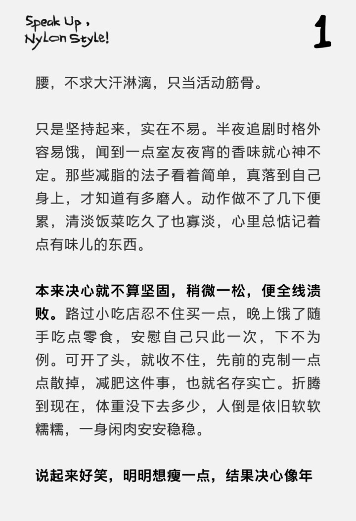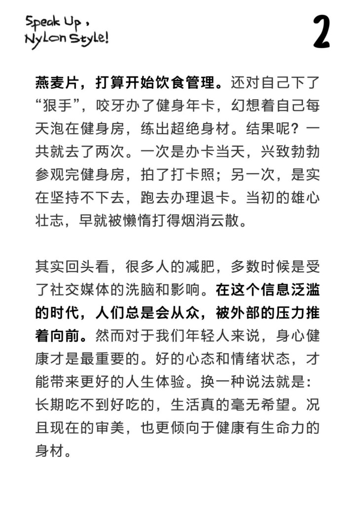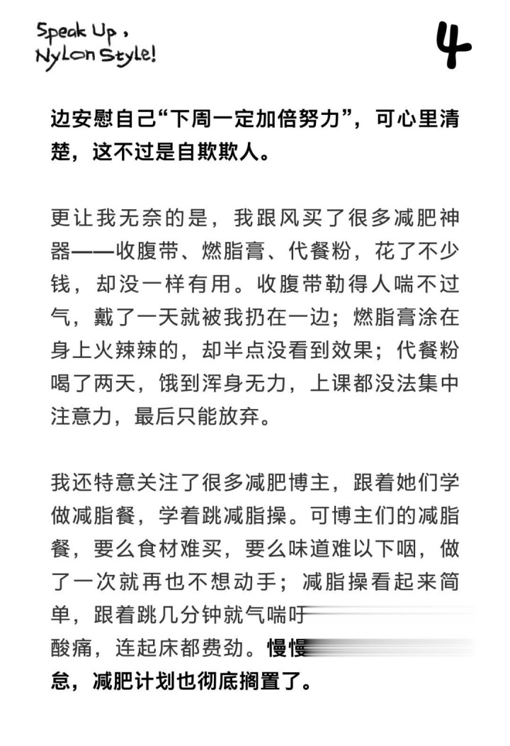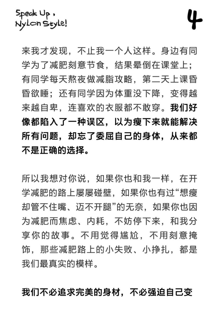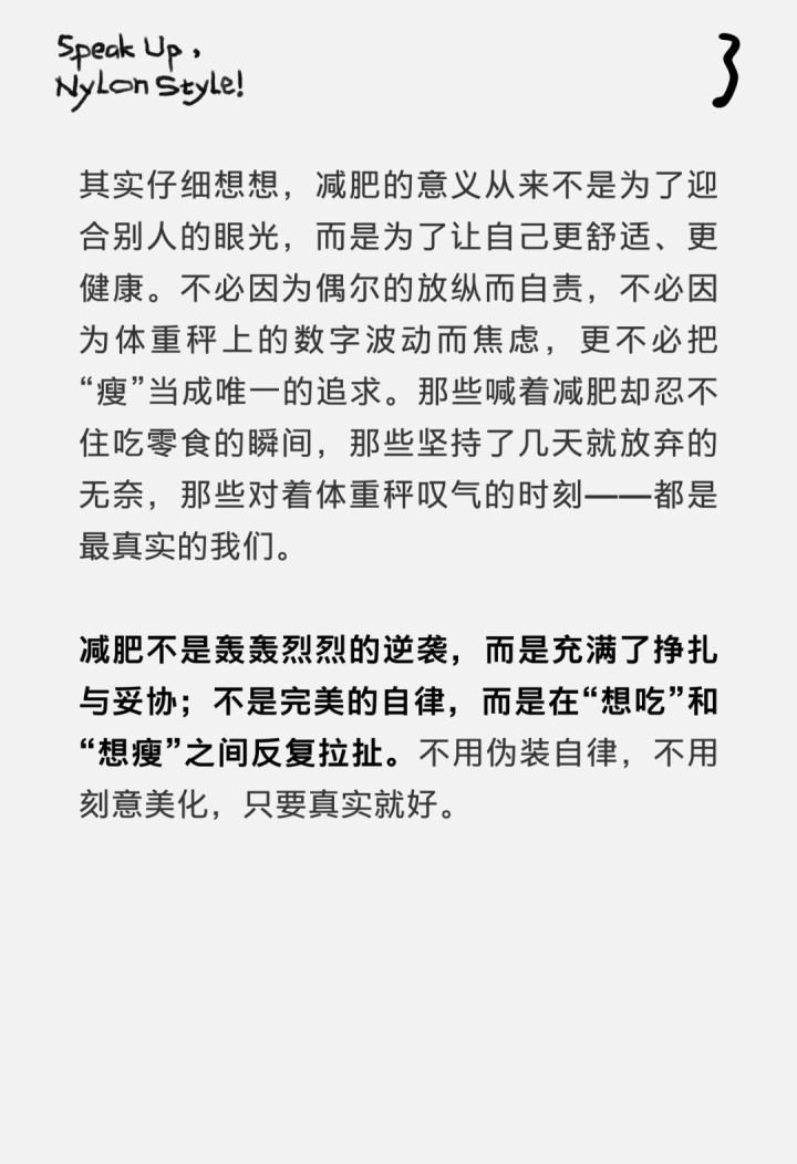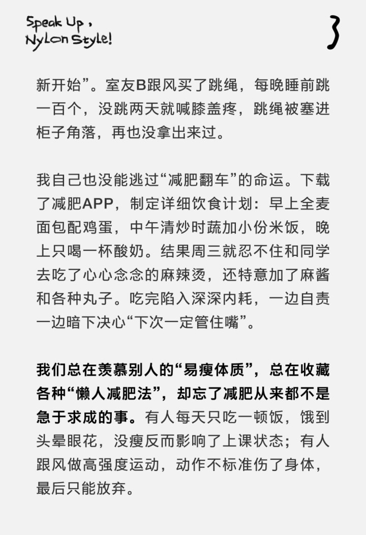 开学了,你上称了吗? 别装了,我知道你假期干了些啥。年夜饭吃了三顿,奶茶续杯到初七,瓜子花生磕到嘴唇起皮,沙发躺出了人形坑。然后你打开小红书,首页精准推送:“开学逆袭,2个月瘦成闪电。 有人把手机壁纸换成了“要么瘦要么死”,然后点开外卖软件,刷了半小时,最后下单了一份轻食沙拉,备注:“多放酱,谢谢。” 有人在小红书收藏了30个减肥食谱,买齐了全麦面包、鸡胸肉、西兰花、燕麦片,拍了张照片发朋友圈:“自律给我自由”。配图是崭新的食材。一周后,鸡胸肉还在冰箱冷冻层,全麦面包已经过期。 还有人更狠,办了健身年卡,去了两次,一次是办卡那天,一次是去退卡那天。 收藏从未停止,减肥从未开始;嘴上喊着自律,身体却很诚实;每次上称都像在开盲盒,永远开不到想要的数字。减肥这件事吧,说起来像一场大型行为艺术:开始得轰轰烈烈,结束得悄无声息。你永远不知道明天和再吃最后一顿哪个先来。 以下,是社团学生开学季的减肥故事。 “我的意志比薄饼还脆” 姓名:紫菜蛋卷汤 学校:中央美术学院 年过罢,人也跟着松快起来。 在家这些日子,桌上菜色总比平时丰厚,炖肉、腊味、炸物、点心,一样样摆上来,热气腾腾,香气绕屋。人一闲,嘴就闲不住,瓜子糖果随手抓,茶水点心不断,吃饱了便往椅子上一靠,晒晒太阳说说话,日子过得温温软软,身上自然也跟着圆润了几分。 等回到学校,换衣服时才觉出些局促,腰腹间松松软软的,比年前沉了不少。于是心里暗暗打定主意,要稍稍收一收,减一减这过年养出的闲肉。 起初也还算认真。早饭吃得清淡,午饭少荤多素,晚饭尽量简单,不再像在家时那样放开吃喝。也试着动一动,傍晚出去走一走,或跟着视频做些简单动作,伸伸胳膊,扭扭腰,不求大汗淋漓,只当活动筋骨。 只是坚持起来,实在不易。半夜追剧时格外容易饿,闻到一点室友夜宵的香味就心神不定。那些减脂的法子看着简单,真落到自己身上,才知道有多磨人。动作做不了几下便累,清淡饭菜吃久了也寡淡,心里总惦记着点有味儿的东西。 本来决心就不算坚固,稍微一松,便全线溃败。路过小吃店忍不住买一点,晚上饿了随手吃点零食,安慰自己只此一次,下不为例。可开了头,就收不住,先前的克制一点点散掉,减肥这件事,也就名存实亡。折腾到现在,体重没下去多少,人倒是依旧软软糯糯,一身闲肉安安稳稳。 说起来好笑,明明想瘦一点,结果决心像年糕一样粘不住,意志比春冰还薄,稍微一碰就破。 其实静下心想想,也不必太较真。年后这点赘肉,原是安稳日子养出来的,是吃得香、睡得足、心里松快留下的痕迹。人生本就不必时时紧绷,偶尔纵容自己一点,也不算什么过错。身材好不好,终究不如活得自在要紧。吃得踏实,过得舒心,精神平和,比什么都重要。胖一点就胖一点,至少日子是甜的,生活是暖的,这就够了。往后依旧慢慢调理,能瘦自然好,瘦不下来也无妨。 人间烟火,本就是吃出来、暖出来、闲出来的。不必为难自己,胖一点是福气,瘦一点是运气,自在才是底气。 顺其自然,开开心心,比什么都强。 “一口气存了30个减肥食谱” 姓名:黄少琪 学校:复旦大学 开学啦,总在社交媒体刷到各种博主的完美身材,于是下定决心:我一定要减肥了!夏天来了,要“瘦成一道闪电,惊艳所有人”。 等收拾好行李回到校园,整个人还沉浸在假期的慵懒里。一上称,数字直接跳出意料之外的涨幅。慌慌张张打开小红书,首页立马精准推送:“开学逆袭,2个月瘦20斤”“大学生无痛减肥法”“一周瘦出小蛮腰”。一条条看得人心潮澎湃,瞬间燃起减肥斗志,仿佛自己马上就能瘦成理想模样。 于是,一场轰轰烈烈却又注定潦草收场的减肥大戏,在校园里准时上演。 兵马未动,粮草先行。先在小红书疯狂收藏,一口气存了30多个减肥食谱,转头冲进超市,买齐了全麦面包、鸡胸肉、西兰花、燕麦片,打算开始饮食管理。 还对自己下了“狠手”,咬牙办了健身年卡,幻想着自己每天泡在健身房,练出超绝身材。结果呢?一共就去了两次。一次是办卡当天,兴致勃勃参观完健身房,拍了打卡照;另一次,是实在坚持不下去,跑去办理退卡。当初的雄心壮志,早就被懒惰打得烟消云散。 其实回头看,很多人的减肥,多数时候是受了社交媒体的洗脑和影响。在这个信息泛滥的时代,人们总是会从众,被外部的压力推着向前。然而对于我们年轻人来说,身心健康才是最重要的。好的心态和情绪状态,才能带来更好的人生体验。换一种说法就是:长期吃不到好吃的,生活真的毫无希望。况且现在的审美,也更倾向于健康有生命力的身材。 如今我早已大彻大悟:减肥从来不是人生的必答题。不用被外界的审美绑架,不用因为体重数字内耗自己。比起强行逼迫自己完成不可能的减肥目标,接纳不完美的自己,好好吃饭、好好生活,过得开心自在,才是校园生活里最要紧的事。 允许自己成为自己,接纳自己——这是我们每个人一生的课题。 “减肥未遂,才是大多数人的开学第一课” 姓名:秋秋 学校:重庆大学 开学返校的行李箱里,除了换季的衣服,大概还藏着每个人都心照不宣的“减肥flag”。在家被爸妈投喂了一个假期,再宽松的卫衣也藏不住悄悄冒头的小赘肉,连镜子里的自己都多了几分“慵懒感”。 本以为开学后,靠着校园里的步行量和规律作息,减肥会是水到渠成的事。直到走进食堂才发现,自己还是太天真。